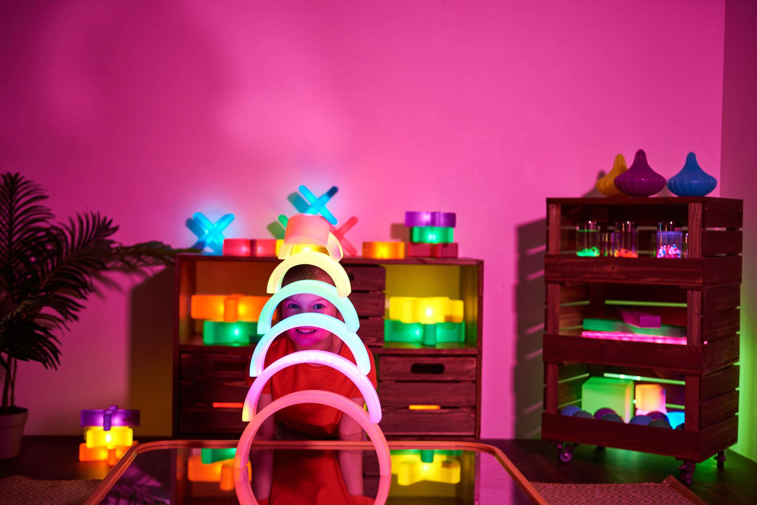 TTS helendav vikerkaar, 7 tk toetab loovat ehitamist selge värvi ja kujundi fookusega. Lapsed saavad kaari paigutada sildadeks, tunneliteks ja varjualusteks ning muuta ehitust, kui nad katsetavad stabiilsust ja vahemaid. Kaared sobivad ka matemaatikaks, näiteks suuruse järgi järjestamiseks, korduvmustriteks ja loendamiseks. Pimendatud nurgas või tunnetustoa tegevustes aitab helendus lapsel paremini keskenduda loodavale konstruktsioonile.