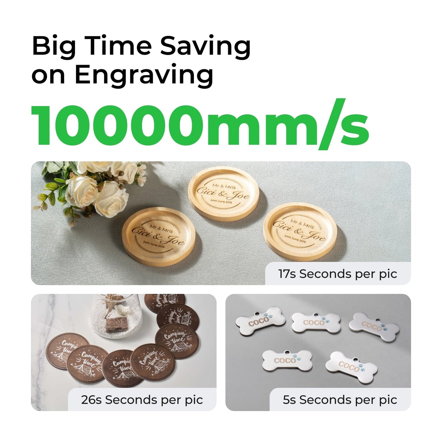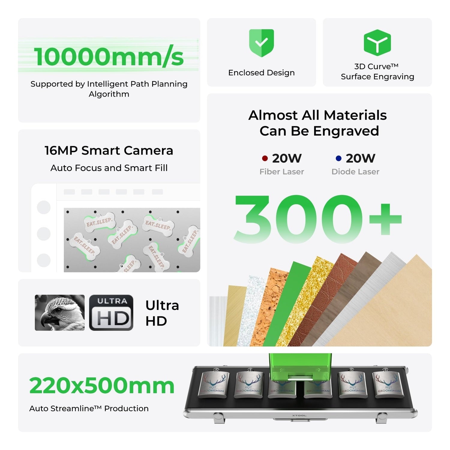 Dual laser engraves almost all materials: wood, acrylic, leather, metal, and more.