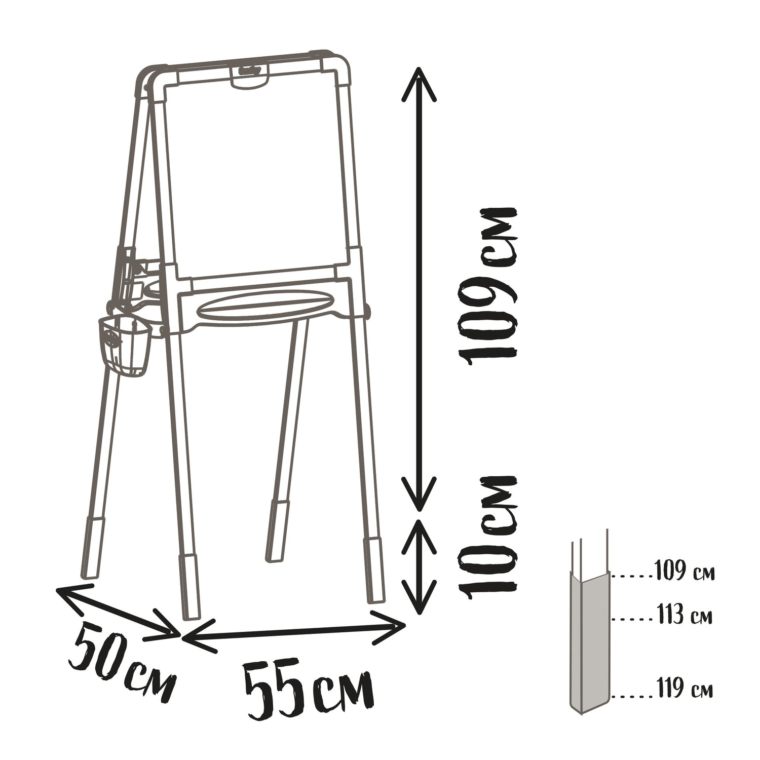 Tahvel on kahepoolne - kriidiga joonistamise pool ja magnetiline valge pool.