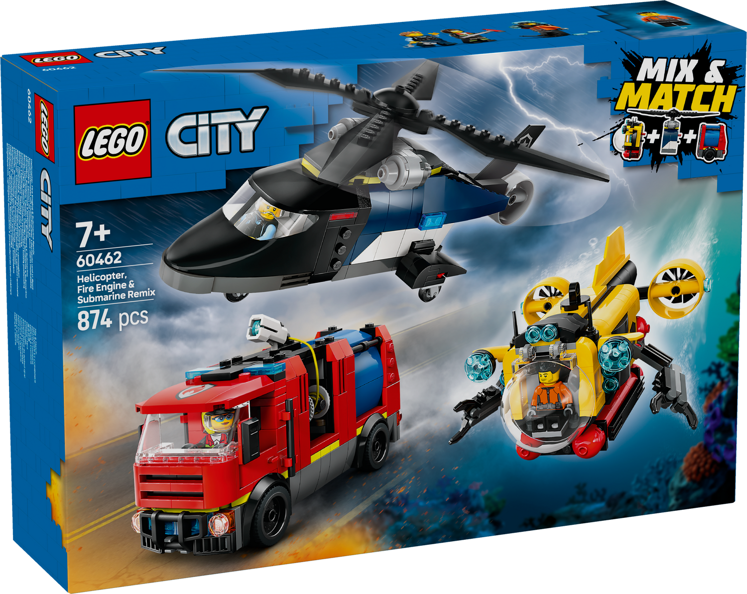 Lastele, kes armastavad ehitada ja luua, meeldib kindlasti LEGO City helikopteri, tuletõrjeauto ja allveelaeva remiksi mängukomplekt (60462).