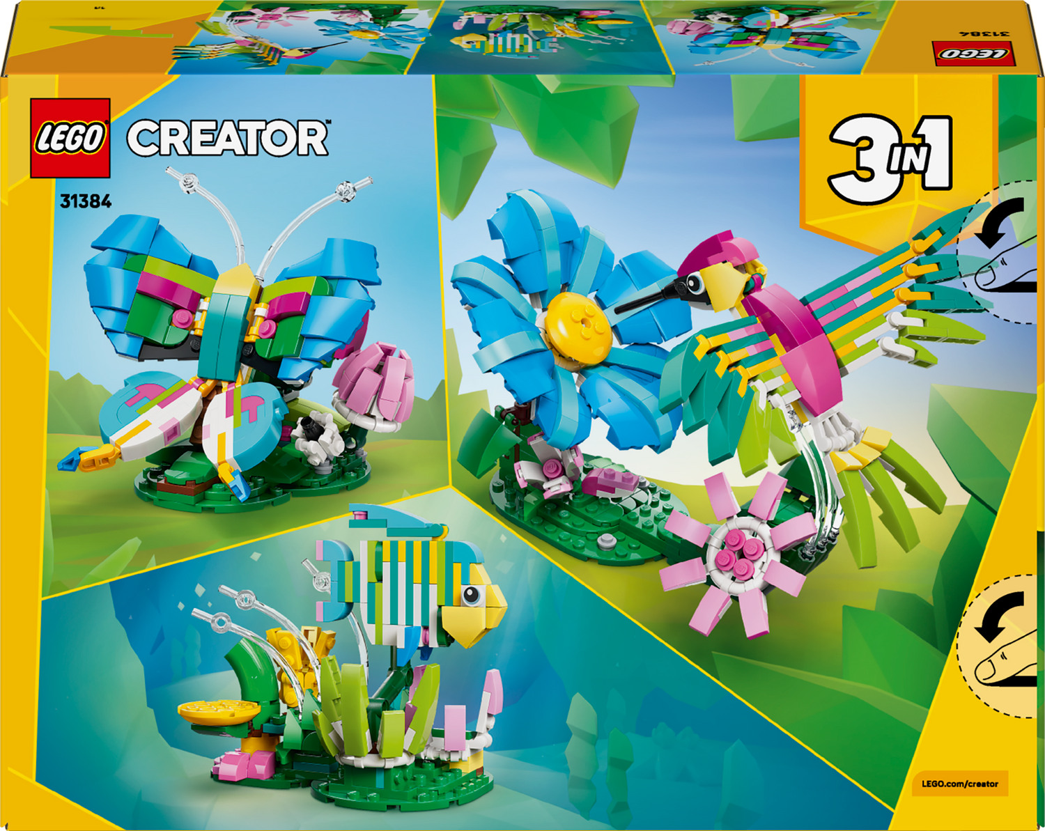 Lapsed saavad ehitada, mängida ja esitleda komplektiga LEGO® Creator kolm ühes Metsloomad: Värviline koolibri, seejärel ehitada see ümber liblikaks või troopiliseks kalaks.