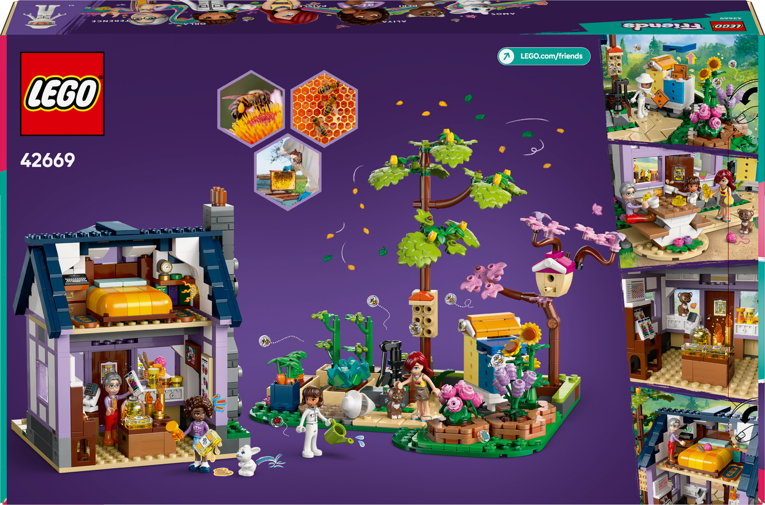 Mesiniku maja ja lilleaia komplektis on 4 LEGO Friends tegelaskuju, kassifiguur ja küülikufiguur ning palju tarvikuid.
