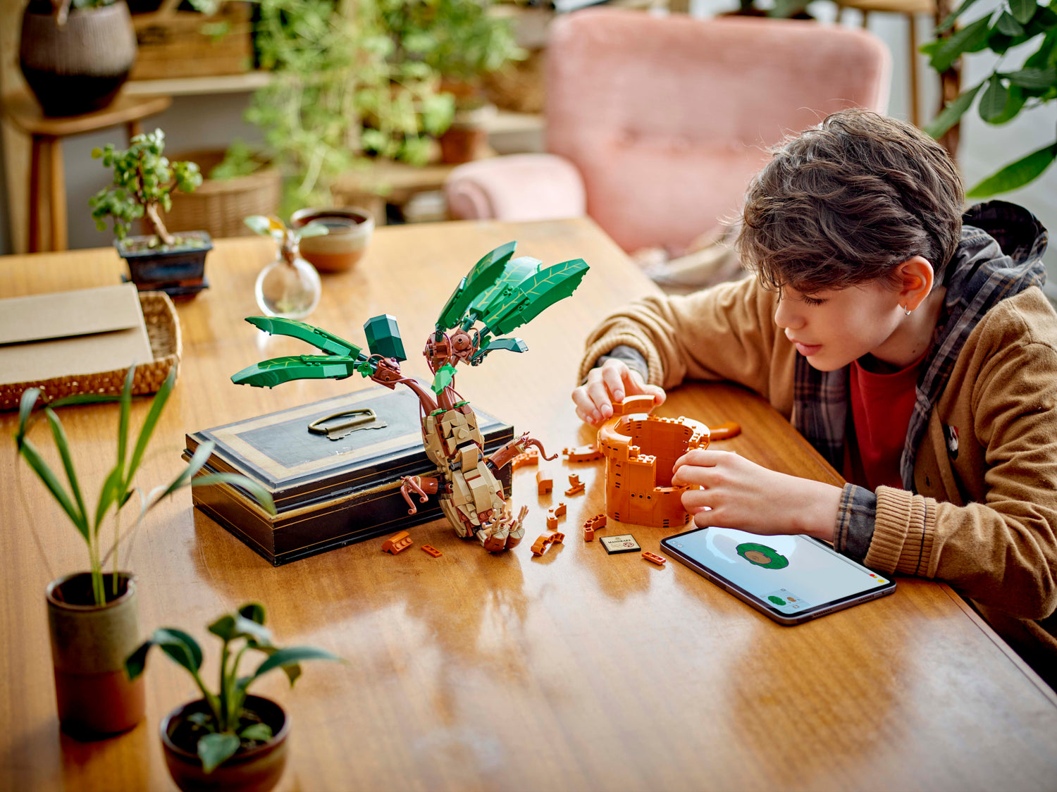 Loo mänguline väljapanek Sigatüüka lossi herboloogiaklassi kuuluva maagilise nõiajuure taime LEGO Harry Potter mängufiguuriga.