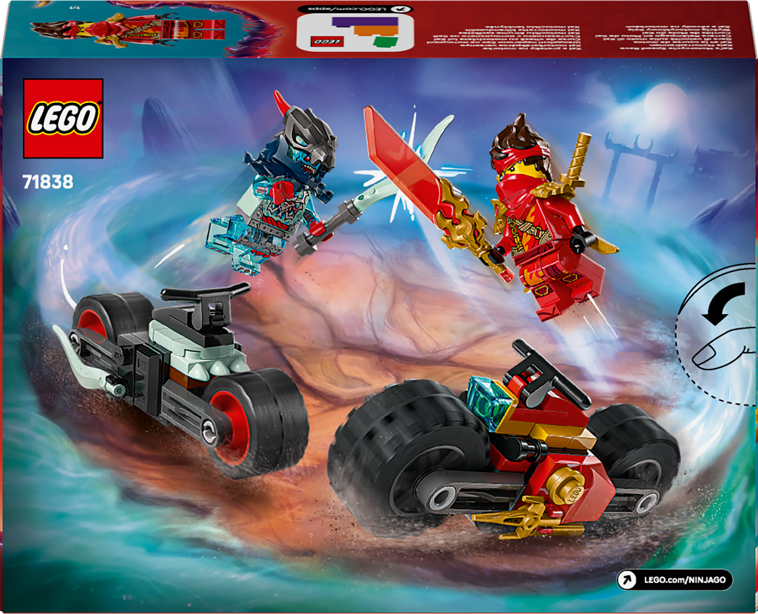 LEGO® NINJAGO® ehituskomplekt 2 ninjaratta ja 2 minifiguuriga võimaldab lastel etendada lugusid telesarja NINJAGO Dragons Rising 3. hooajast.