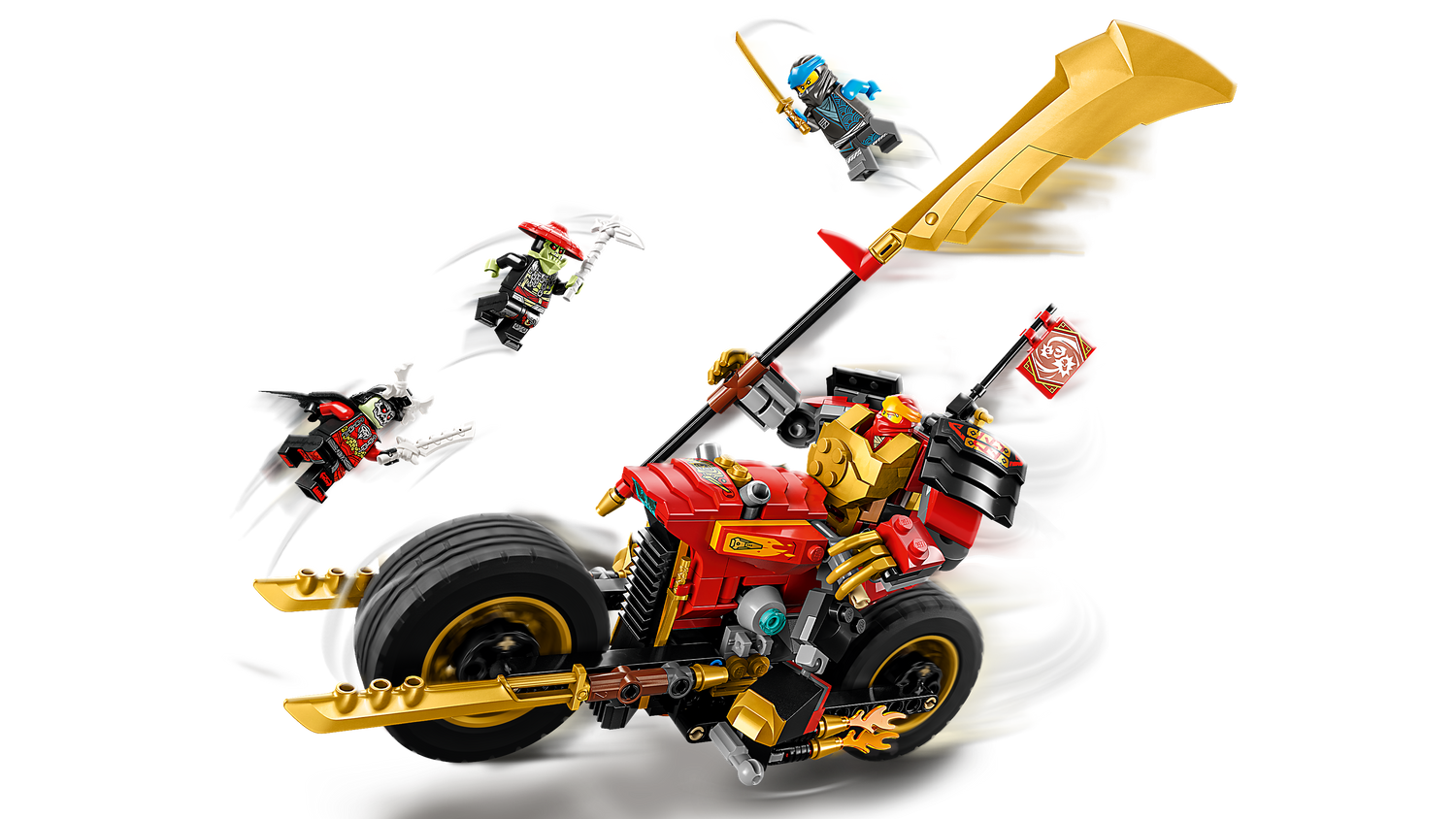 NINJAGO® komplekt lastele ja kiirete sõidukite fännidele kaasahaaravate lahingute etendamiseks täiustatava ninjamootorratta, muudetavate asenditega roboti ja nelja minifiguuriga.
